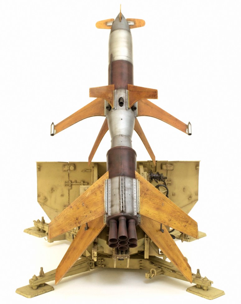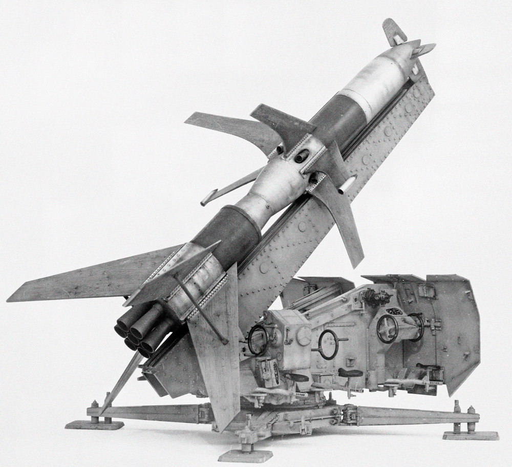 In 1942 the Luftwaffe asked Rheinmetall-Borsig to develop an anti-aircraft missile and the Rheintochter 1 was the result. It was a subsonic, two-stage, solid-fuelled, radio controlled rocket that was ground-launched from a rail attached to a converted 88mm Flak 41 gun mount. The four smaller fins at the tip of the nose were radio controlled and used to guide the missile towards its target. When close enough to the target its 150kg warhead was detonated by the Kranich acoustic proximity fuse which was housed in the control compartment in its nose.