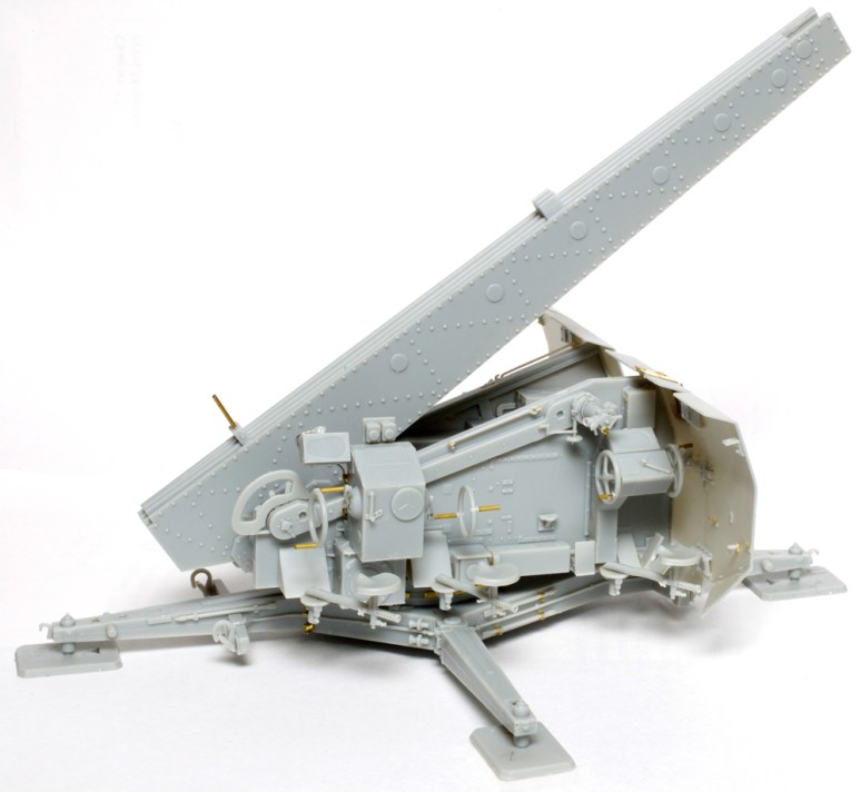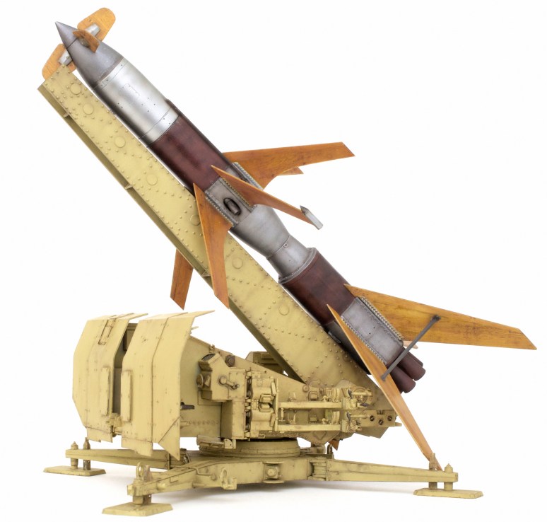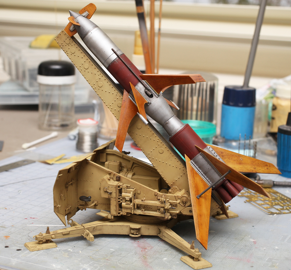 The Flak 41 gun mount construction complete. Note the brass pin protruding from the launch rail. This pin fits into a corresponding hole that has been drilled into the rocket and holds it securely in position.