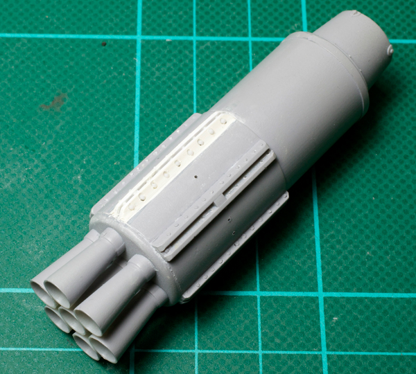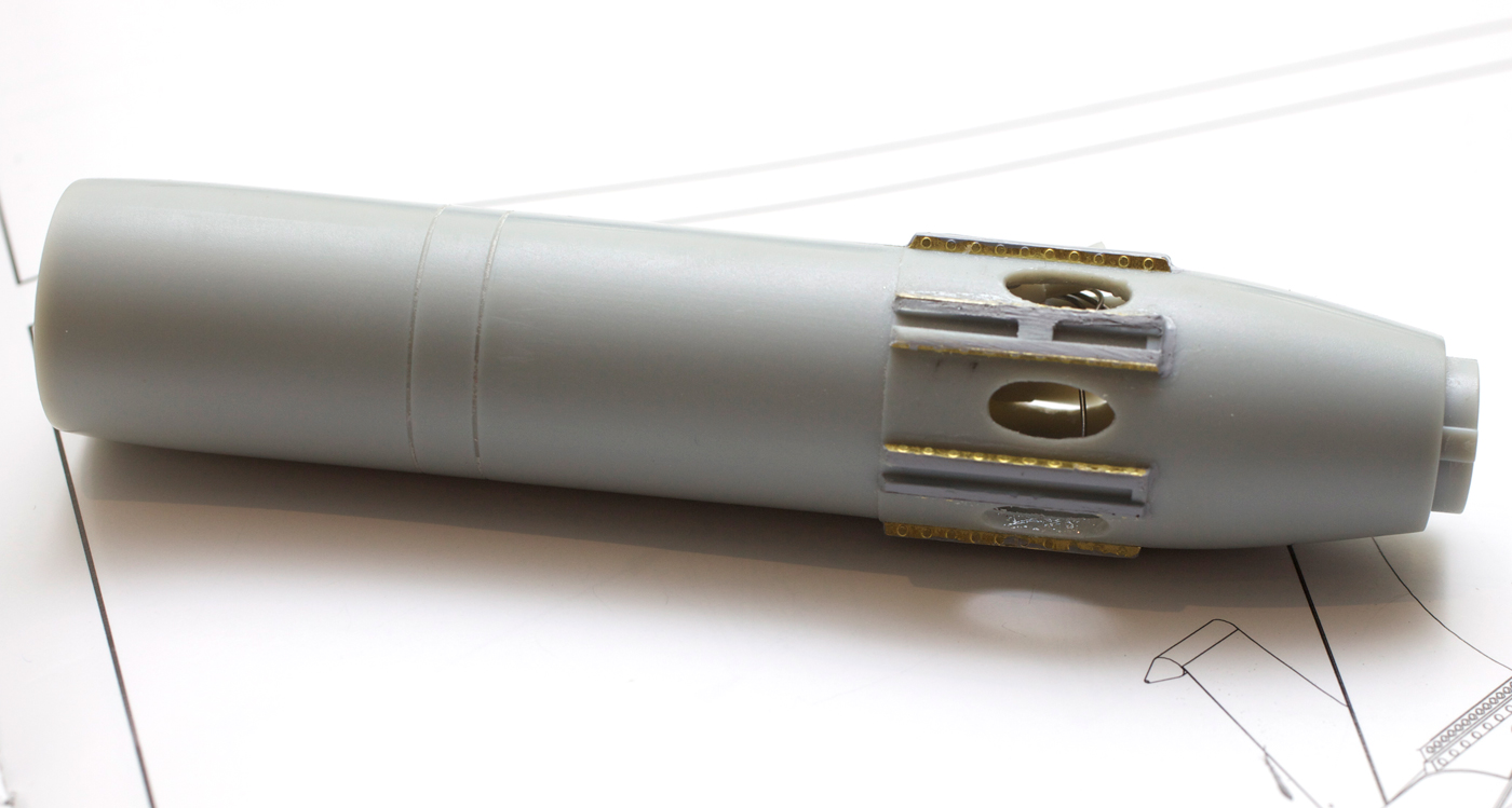 Once all the fin brackets were finished I noticed that the very heavy, bolted seam joint on the fin sleeve had been omitted by the manufacturer! I added this rather prominent detail using plastic strip, rod and Milliput.