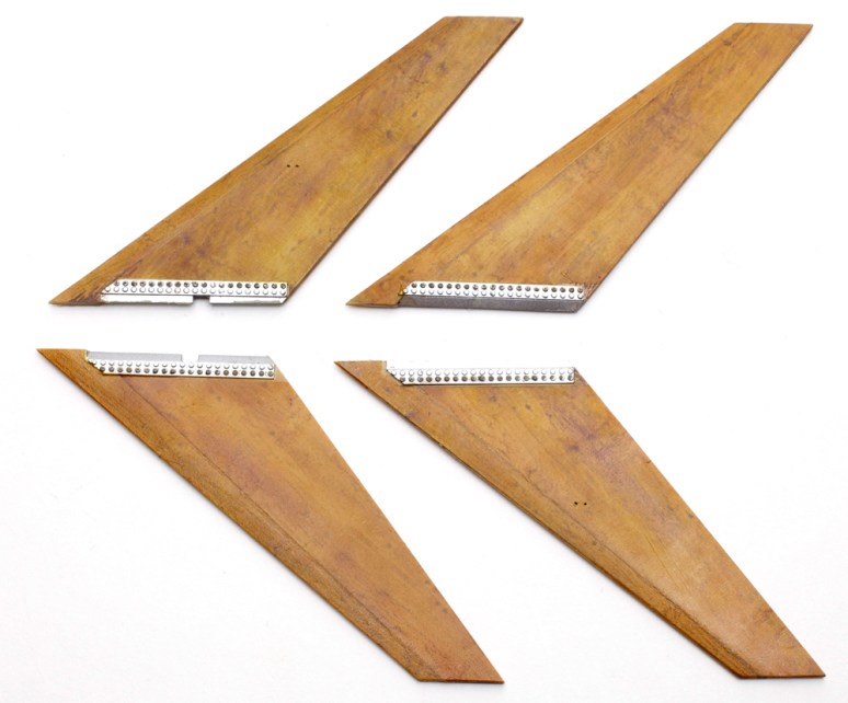Rather than the large, flat wooden fin braces that were attached to the outer tips of the four rear stabiliser fins, I chose the option of the much more discrete angled metal ones that were bolted to the inner surfaces of the two outer fins. The flat P/E items supplied in the kit were discarded and replaced with more accurate ones made from Evergreen plastic strip and rod.