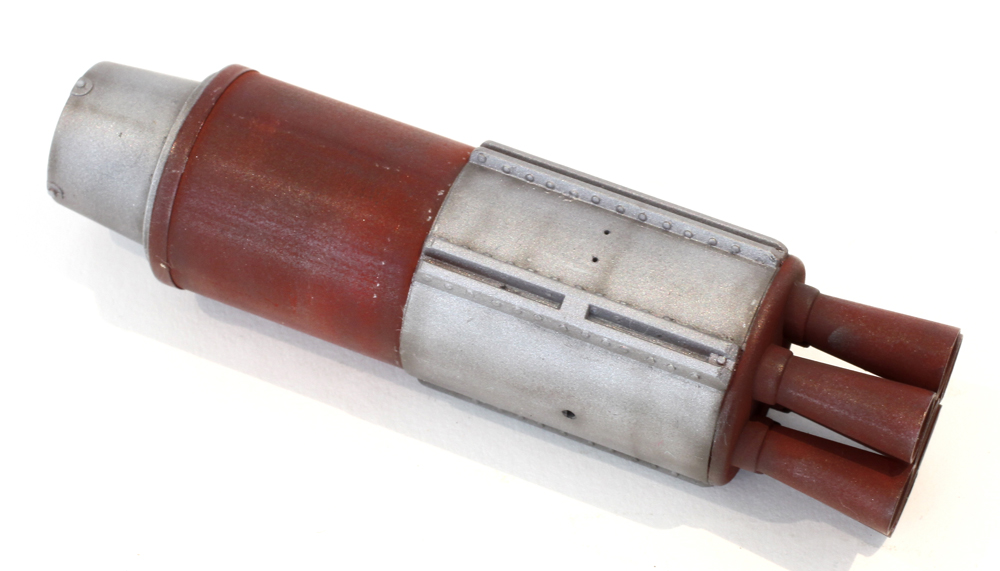 Painting and weathering is almost complete. The dark red colour of the fuel cells and the first stage exhaust nozzles represents red primer because in reality these parts were made of sheet steel. This colour is a mix of Tamiya XF-7 Flat Red and XF-64 Red Brown. The rest of the missile was masked and sprayed various shades of silver and metallic grey from the wonderful range of Alclad II lacquers. Note also in this and the next shot the various screw holes, panel lines and other holes that have been added after careful study of reference photos. Some were added after painting was complete as new reference pics were discovered.