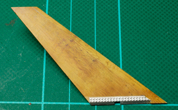The decal was then cut to fit the shape of the fin as closely as possible. Note also that great care was taken to make sure that the line of the woodgrain pattern on the decal followed the shape and angle of the fin. In reality the fins were made from two pieces of ply, with the shaped leading edge being a separate piece added to the main fin. I tried to achieve this look by applying the decal in two separate pieces that were cut from different areas of the decal sheet.